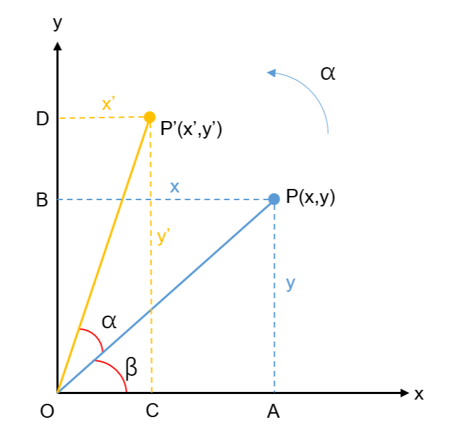 上述矩阵即为二维旋转矩阵,通过该矩阵可以实现点 $P$ 绕原点 $O$ 逆时针旋转 $\alpha$ 角度后的坐标 $P’$ 的计算。